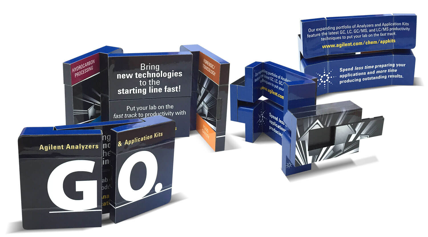 Holding a scientist’s attention can be a tricky task. This trade show promo item places Aglient’s message in an ever-unfolding block. But this is not just a toy, it also has a small USB drive that slides out.