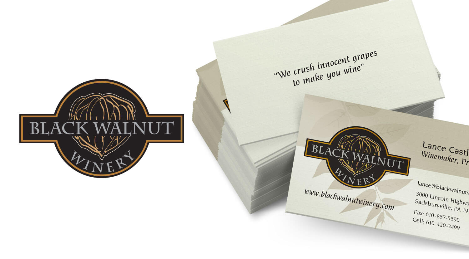 At the time, Black Walnut was just a fledgling winery with a modest budget. However, they still needed a business card with depth—like their wine. Colored paper stock and the use of three printing inks provided great tonal range while keeping the job in budget.