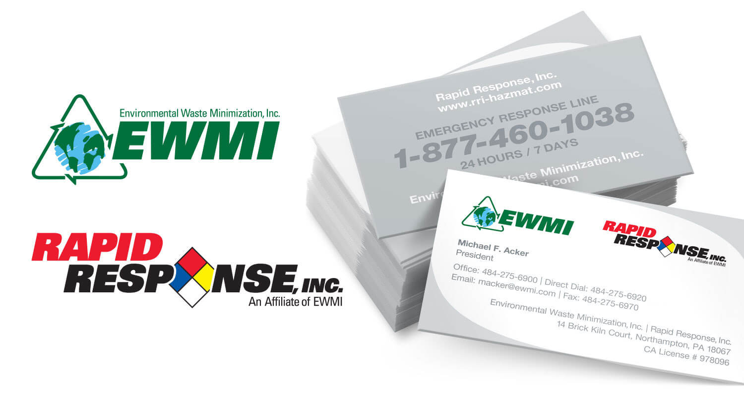 The EWMI/RRI stationery has to work twice as hard with two companies under one roof. After designing each logo, we found that the stationery system needed a neutral color to tie the companies together. Gray did the trick and it worked as a single imprint color for employee business cards.