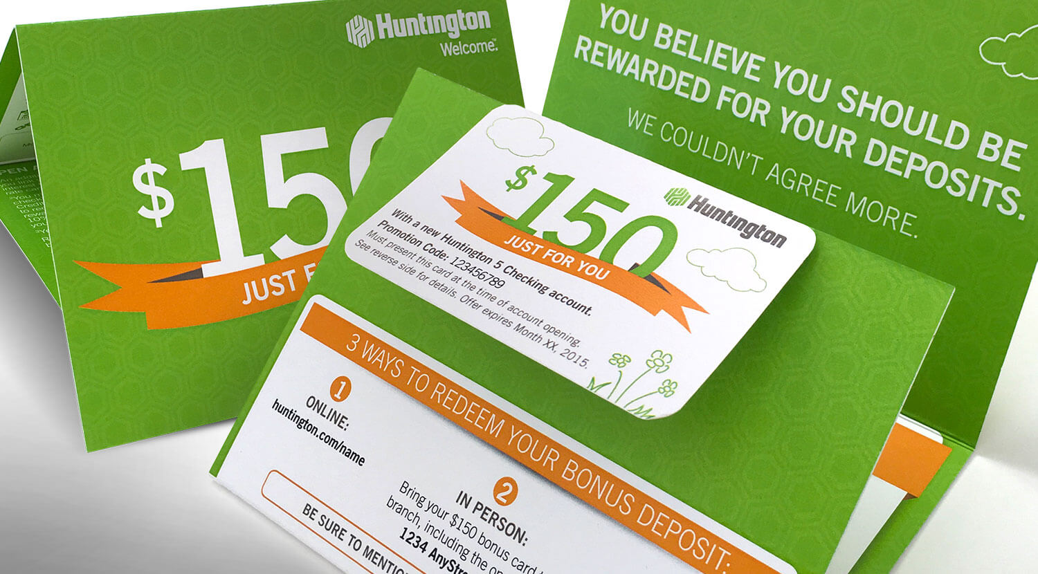 This flexible format was created for Huntington Bank. It's personlized with name, address and promo code. The card is an easy-tear-off action device to get prospects into the branch, but a PURL is also supplied for online access to the promotion.
