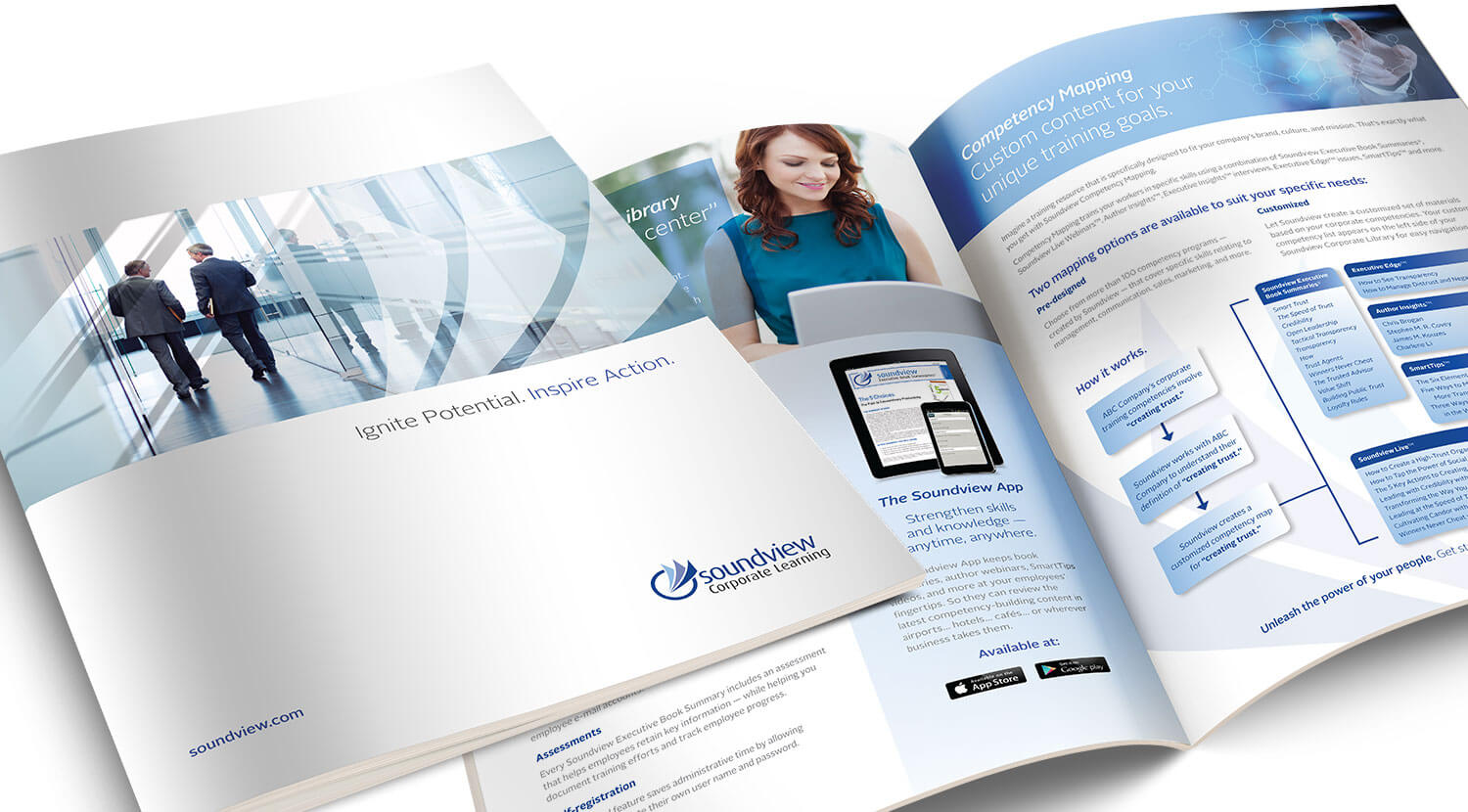 In the tiniest nutshell, Soundview creates 8-page summaries of leading business books and delivers them via subscription. What they really do for an executive is ignite potential and inspire action. So we redesigned their brochure to say just that… and tied customer benefits to all of their product offerings.