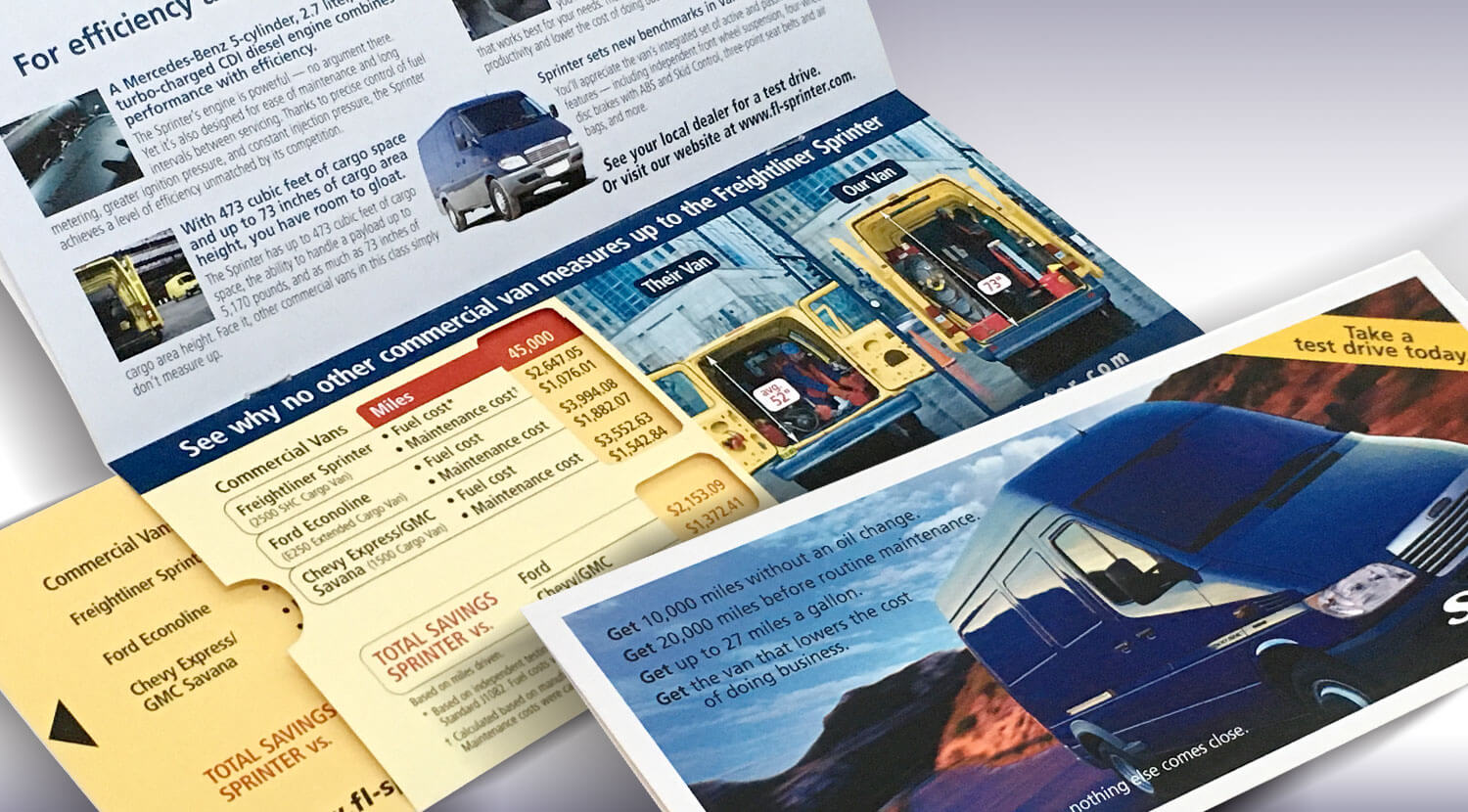 This unique-looking van that is taller than it is wide is called a Sprinter. Freightliner wanted to point out that size was not the only difference in owning this van. So we created a self-mailer that included a personalized letter, brochure copy and a slide rule showing head-to-head comparisons with the competition on fuel and maintenance costs at different mile segments. And the whole thing was printed on one sheet of paper.